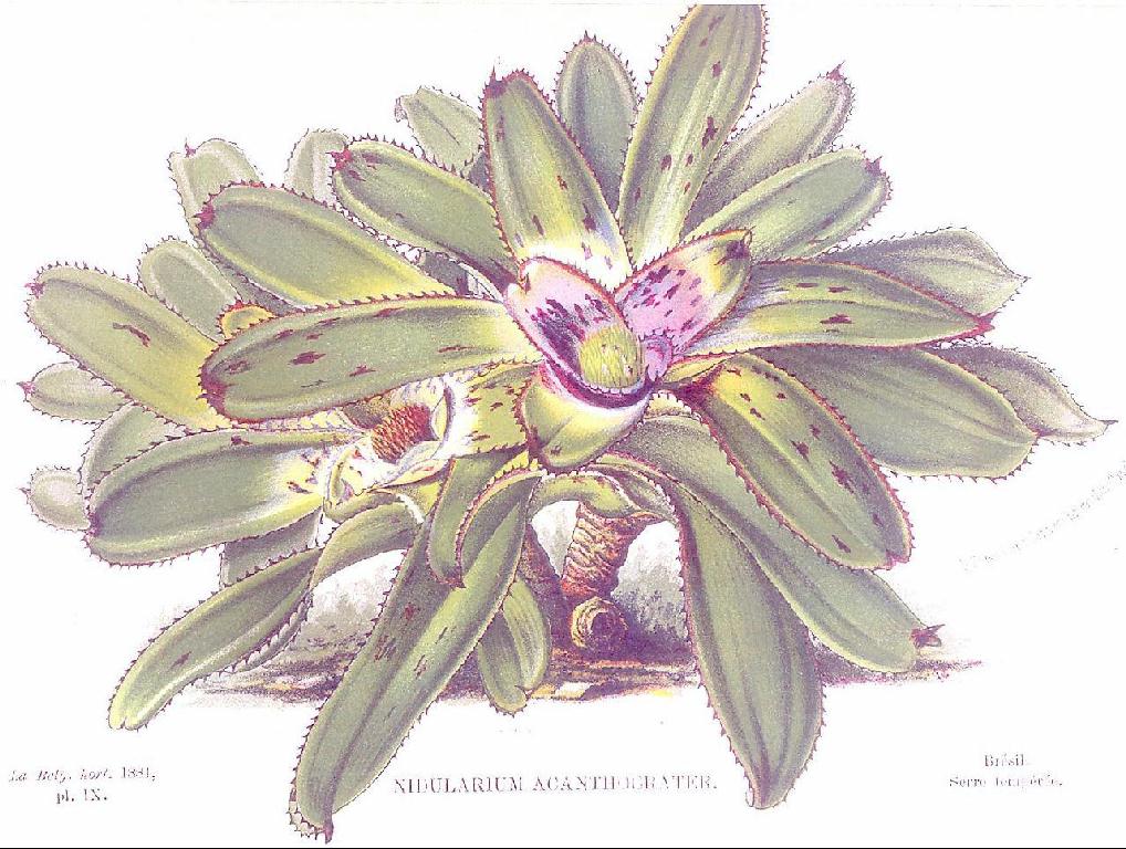 One of its synonyms is acanthocrater named by Morren in 1884 and is a name you sometimes hear about in horticultural circles. What is more interesting is that this species had two varieties namely ‘Plutonis’ and ‘Proserpine’ which crop up from time to time. To my mind there must be 3 forms acanthocrater, ‘Plutonis’ and ‘Proserpine’. We know what Nidularium acanthocrater looked like because we had a copy of the painting done by Stroobant for Morren in 1884 courtesy of Len Colgan who had acquired a CD a few years ago of many of these old paintings. And, yes it was Nidularium in those days.