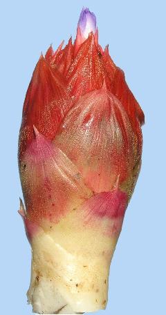 SCAPE BRACTS subreniform, rounded and apiculate, densely serrulate, ca. 2.5 cm long, glabrescent, the upper ones (involucral bracts) broadly ovate, 4.5 x 3 cm, spinulose near the apex, slightly inflated, red with green spots.
