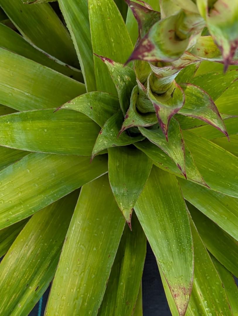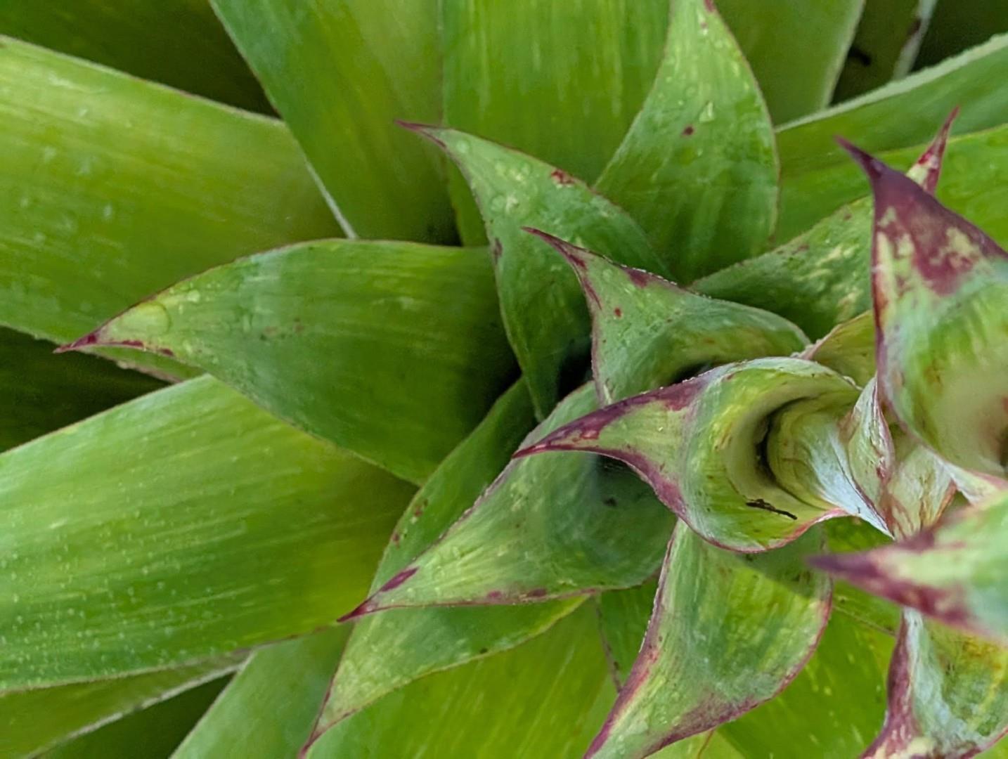 BLADES narrowly triangulate-attenuate, 65-100 cm long, 9-14 cm wide near the base, not narrowed at base, apex acuminate and recurved, glabrous and green on both sides but the inner ones with narrow, white-cretaceous crossbands.