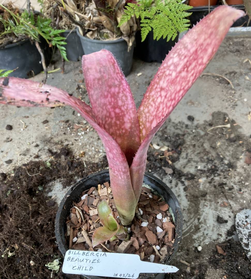 Billbergia Beauty's Child BCR ... "Mature tubular rosette to 30cm high, flaring at the top. In strong light, arching dusky pink leaves tinged green with prickled maroon edges. Heavily spotted/marbled cream foliage which lightens with age. Erect, simple inflorescence of rosy red scape bracts, puce ovaries, dusky pink sepals tipped mauve and mauve flowers. Reg. Doc. 5/2021 by Jan Evans."