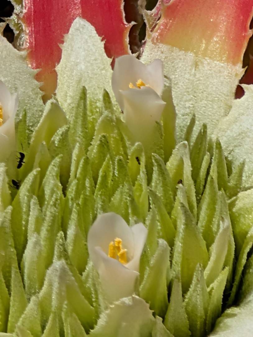The plants grow in relatively humid crevices, usually in the full sun. Outside the flowering period the leaves are similar to, for example the genus Aechmea Ruiz & Pav., but more clamped together. Only with flowering do you get a 35cm diam rosette. The plants are like this for 6-8 weeks. The flowering phase is over 2-3 weeks then after a further 2-3 weeks, the red and white colour of the leaf has virtually vanished again.