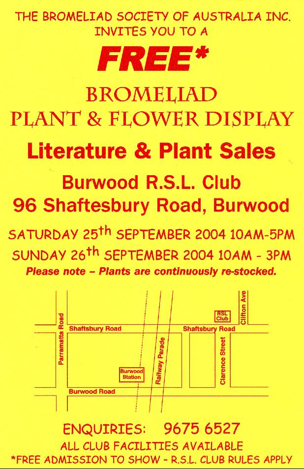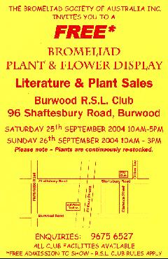 The 2004 Spring Show, competition, and sales were held at the Burwood RSL club on Saturday 25/09/04 10AM to 5PM and Sunday 26/10/04 10AM to 3PM.