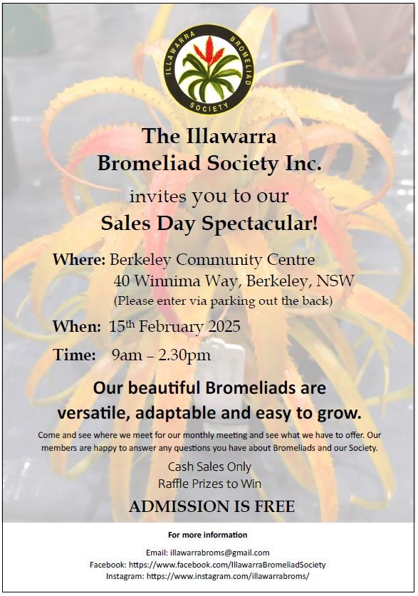 | 11 12 13 14 15 16 17 | 12=Brom talk at Eastwood Evening Garden Club 16= Illawarra Brom.Soc. Sales Day, Berkeley Community Centre 9am-3pm |