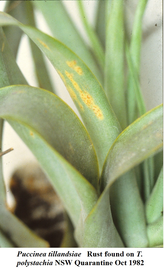 Tillandsia rust (Puccinea tillandsiae) was first reported in Bromeletter Nov/Dec 1982. Since then it has slipped through quarantine and is now showing up in Australian collections.