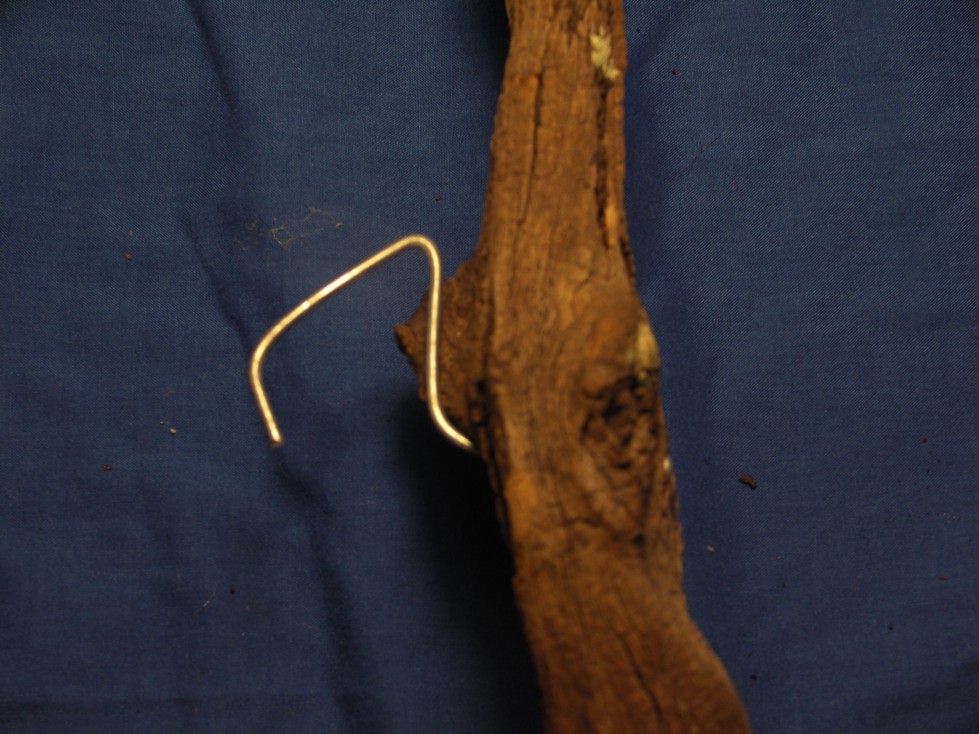• To do this cut a length of wire [ ~150 mm or longer], and bend over one end (~10 mm in length) until folded onto itself (to keep it from going through the hole—but will stay pretty much flush--on the front side of the mount). Feed the wire through and then make 3 (three) angled bends to create a hook (see below).