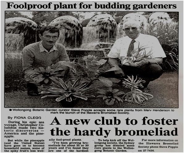It all began after an article appeared in the Advertiser newspaper to let Illawarra residents know of the possibility of starting up a local bromeliad society in the area. This article had been at the instigation of Merv Henderson, a member of the Bromeliad Society of New South Wales, whose dream it was to introduce more people along coastal New South Wales to the beauty of bromeliads. And so it was that on February 1, 1992 about 20 people met at the Education Centre of the Wollongong Botanic Garden to discuss this proposition. Tremendous support was also given by other members of the New South Wales Society, many of whom travelled down to stage a very beautiful exhibition of bromeliads in readiness for the visitors who would attend the meeting. It was apparently a most inspiring, friendly and successful occasion and Merv’s aspirations were fulfilled as the Illawarra Bromeliad Society was formed, the inaugural meeting being held on March 7, 1992.