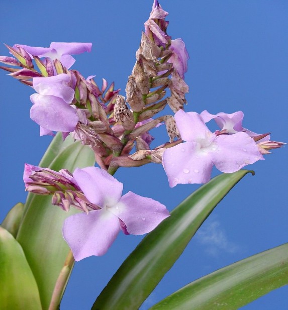 T. cyanea having 4-5 cm long floral bracts with T. lindenii’s floral bracts approximately 5 cm or greater. The floral bracts have the same width, but because of the shorter length the overall simple-spiked, sword-shaped inflorescence of T. cyanea appears to be more elliptical than that of T. lindenii, which is slightly lanceolate. Although the original descriptions given for the bracts of these two plants state they can be pink or green, it is my experience these color variations are sensitive to cultural differences with high light producing the more intense pink or rosy color.