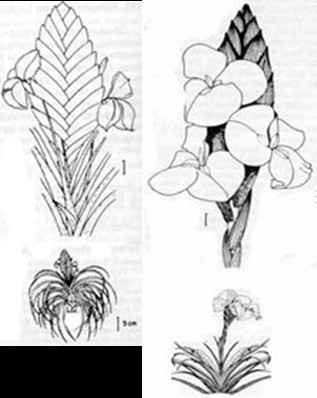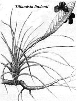 The pictures on the right, above, are horticultural drawings which demonstrate some of the more obvious differences between these two tillandsias. T. cyanea (left) has a more blunted, elliptical “paddle-shaped” inflorescence and a shorter scape than T. lindenii (right). If you look closely, the artist has delineated the white throat of the flowers of T. lindenii var. lindenii. (From Smith and Downs, l977.)