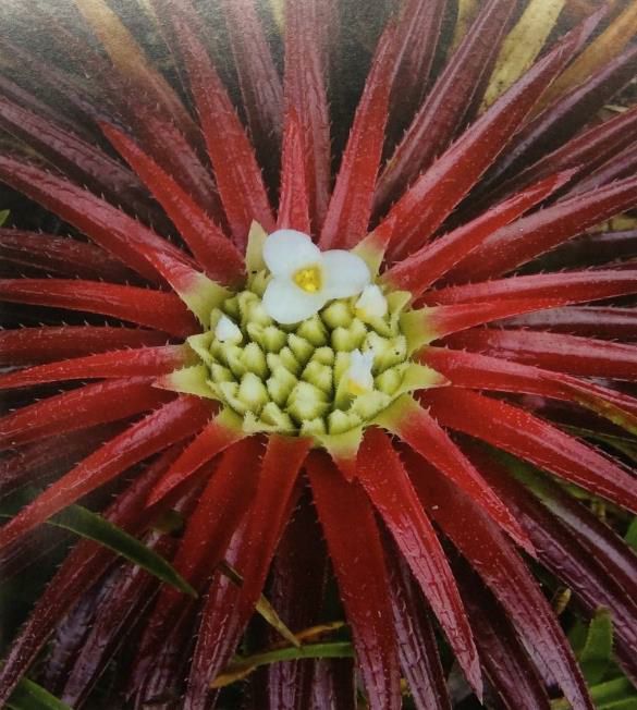 In contrast, there is a small group which have the flowers and floral bracts nestled in the centre of its flattened rosette [this group recently moved to the genus Sincoraea—Ed.]. This group has been considered to include some of the most eye-catching bromeliads. Most have 40 plus narrow pointed leaves edged with sharp, hard spines. At blooming, the centre of the plant, and sometimes the entire flattened rosette, can flush with red, rose, pink or coral leaves with similar shaded floral bracts. The visually contrasting white flowers draw pollinators from miles away.