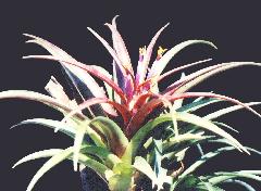 New Chum Alan Phythian lead the way. He comes from Bribie Island in Qld and has been converted from Orchid growing. Alan says the trend for the true Orchid collector is towards species and he is following this into tillandsias. Therefore, when he has a Tillandsia coming into flower he takes it to his Orchid house so if it does set seed, there is little danger of accidental cross pollination. Now here was a man to my own heart! He is mad keen to get seed from other sources but finds it a difficult job. In these cases he will have to beware that unknown pollen factor. He talked about diploids, triploids, and tetraploids etc as though they were all common knowledge.