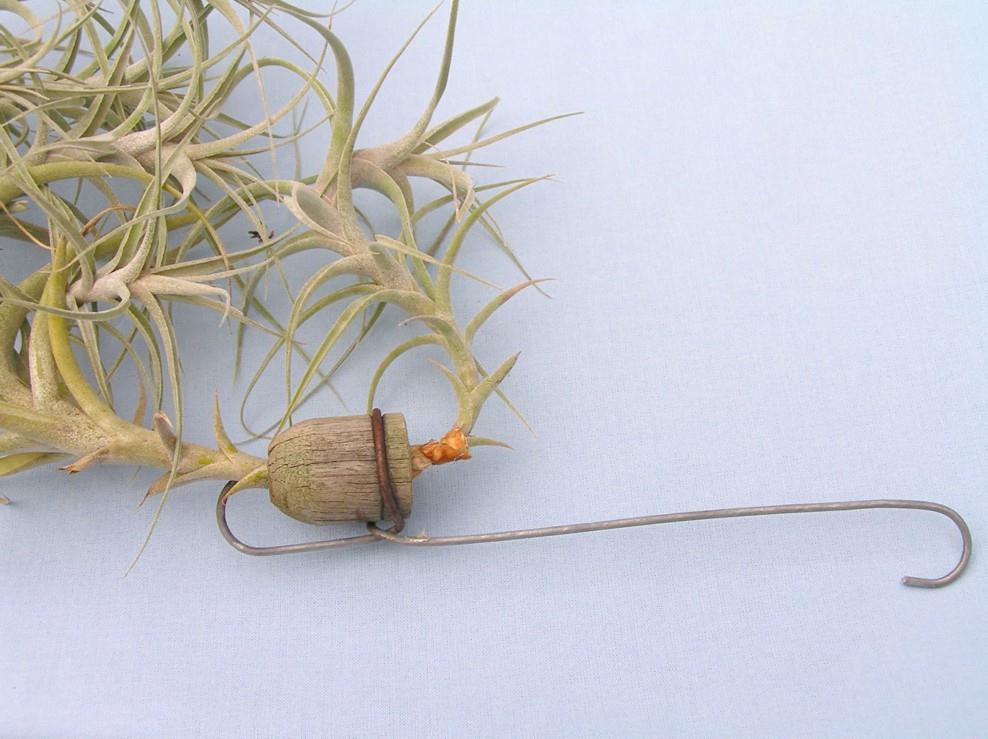 George did forget to bring in his famous ‘George’s hooks’ which can best be described as modified butcher’s hooks. He saw the idea when translating some of the past editions of Die Bromelie - The German Society Journal. In Europe they grow tillandsias outside in the summer and bring them indoors or in a heated glasshouse for the winter. So space is at an essence in the winter and if you can save hanging space so much the better. Using wire coathangers George twists into the middle part of the ‘S’ hook a wooden toggle which is hollow. Tillandsias can then be attached either end or both ends using the trusty sealant. While in Germany they can have long strings of these hanging one under the other we do suggest that in our conditions you only have 3 or 4 at the most. See photo in case you cannot understand my explanation!