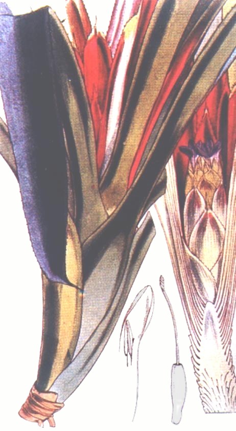 SCAPE BRACTS subreniform, rounded and apiculate, densely serrulate, ca. 2.5 cm long, glabrescent, the upper ones (involucral bracts) broadly ovate, 4.5 x 3 cm, spinulose near the apex, slightly inflated, red with green spots.