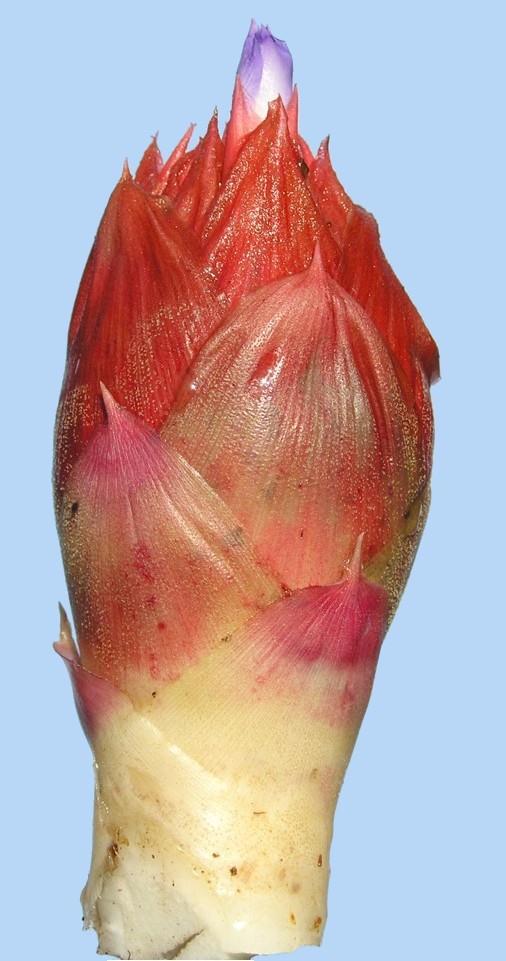 LEAVES ca. 20 in number, spreading at anthesis, forming a broad crateriform rosette; LEAF SHEATHS broadly elliptic, 11 x 10 cm, densely brown-lepidote on both sides, purplish mainly adaxially;