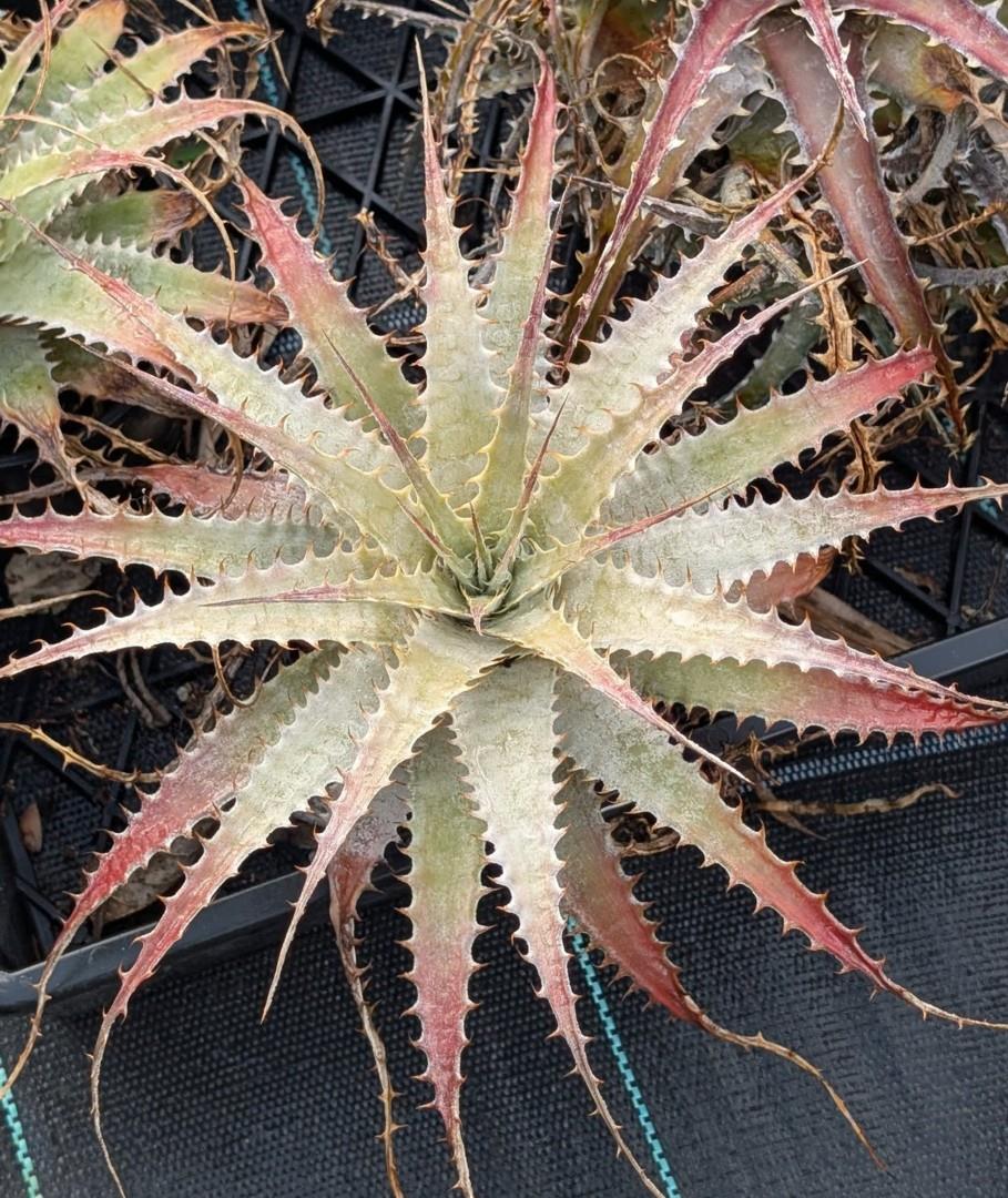 Blades (12-) 20-30 (-40) x 2-4 cm, recurved, adaxially concave, spinose-serrate, lepidote, greenish, greyish or reddish.