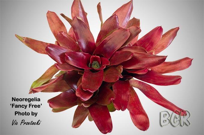 Neoregelia Fancy Free BCR ... "cvs. from a very variable grex of hybrids from plants selected by Carrone and named marmorata 'Red Variety' X carolinae 'Extra Special' - many of which exhibited 'total color' from base to tips - grex has extreme variety. (Cvs. = 'Full Reward', 'Strawberry Ripple', 'Pink Chiffon' & 'Copper Queen'). Reg. Doc. 1977, JBS 27:250,265ill; 28:17ill-19, Baensch 126ill, ColorBroms 97ill, PineapplePl 81" marmorata 'Red Variety' x carolinae 'Extra Special' by J.Carrone, Louisiana USA, 1973.