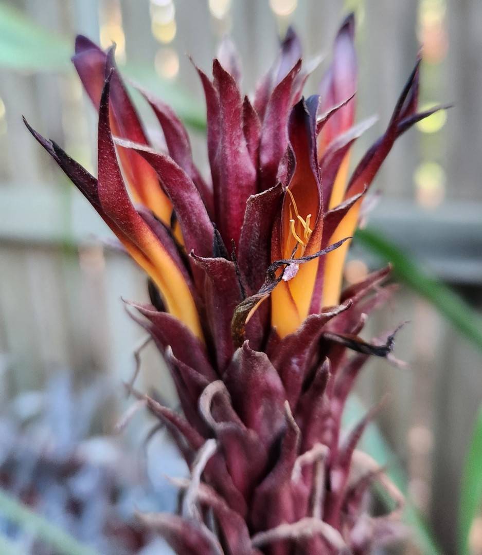 Floral bracts elliptic with a reflexed, triangular apex, 55-85 mm long and 20-30 mm wide, entire, densely brown-lanate, reddish brown.