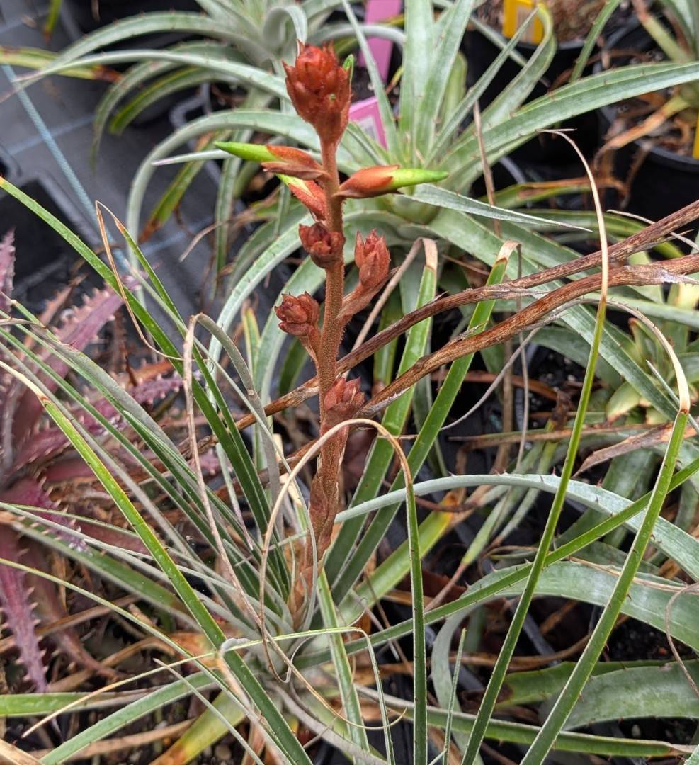 Remarks: Also like Puya ferruginea (R. & P.) L. B. Smith is the inflorescence, primary bracts and sepals of Puya cochabambensis sp, nov. which have a loose coat of ochre brown to red brown starlike hairs. The new species clearly differs from this in its smaller size, the formation of cushions, stiff, essentially narrower and shorter leaves with smaller spines, a simple and unbranched inflorescence with half-erect to horizontal flowers, lanceolate floral bracts, oval-triangular sepals and oval linear petals. P. ferruginea is found in Cochabamba in moist mountain-rain and cloud forests, whereas P. cochabambensis sp.nov. comes from the dry Andean area over 3500m. Smith & Downs (1974) noted P. ferruginea as a very variable speces with very different large flowers. The above characteristics are now compared in Table 2.