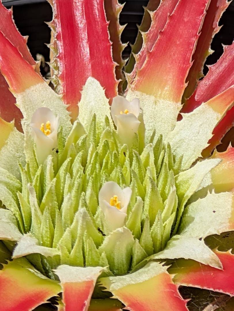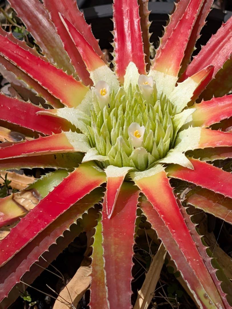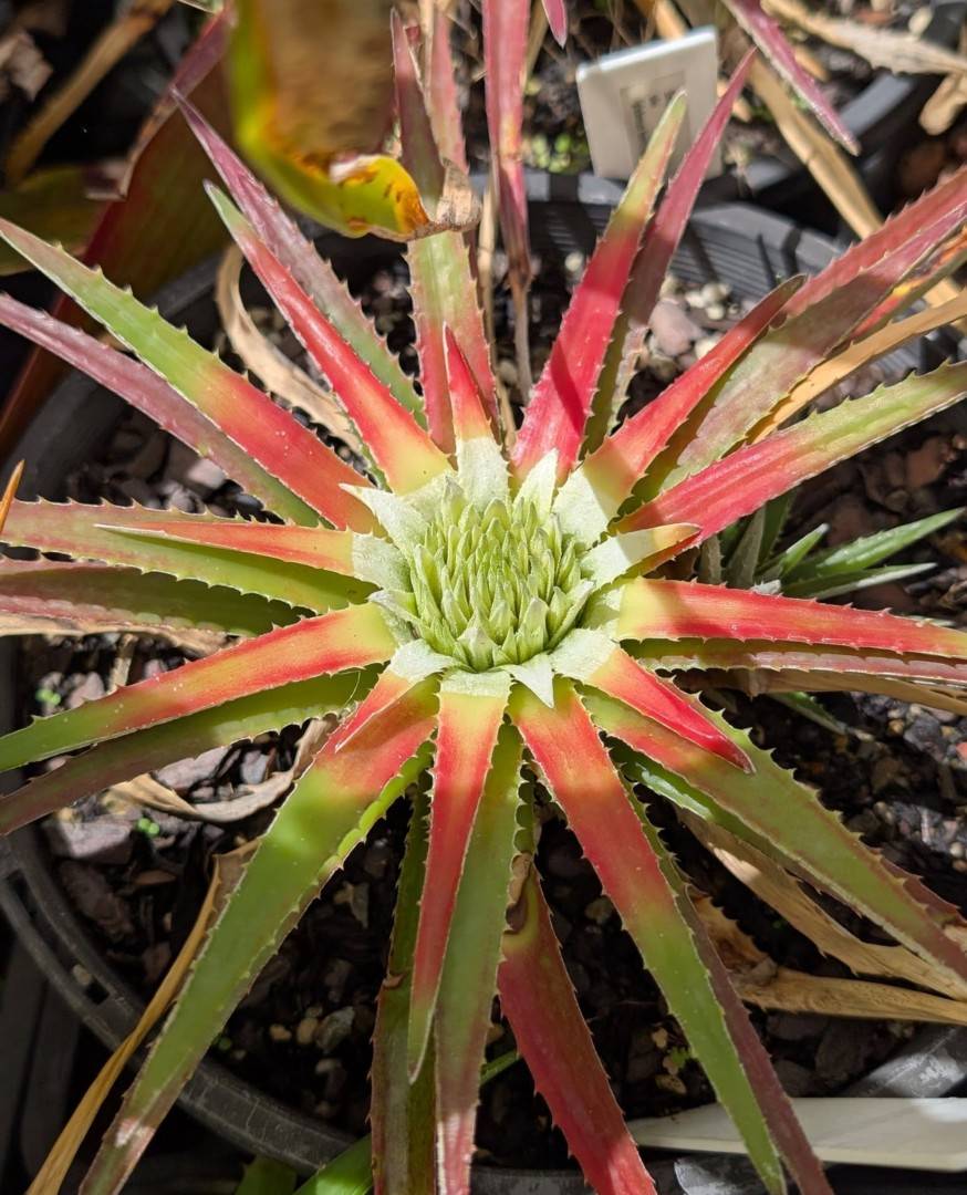 The plants grow in relatively humid crevices, usually in the full sun. Outside the flowering period the leaves are similar to, for example the genus Aechmea Ruiz & Pav., but more clamped together. Only with flowering do you get a 35cm diam rosette. The plants are like this for 6-8 weeks. The flowering phase is over 2-3 weeks then after a further 2-3 weeks, the red and white colour of the leaf has virtually vanished again.