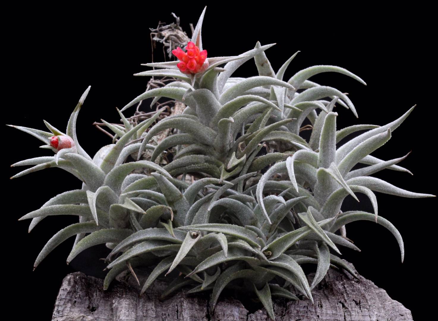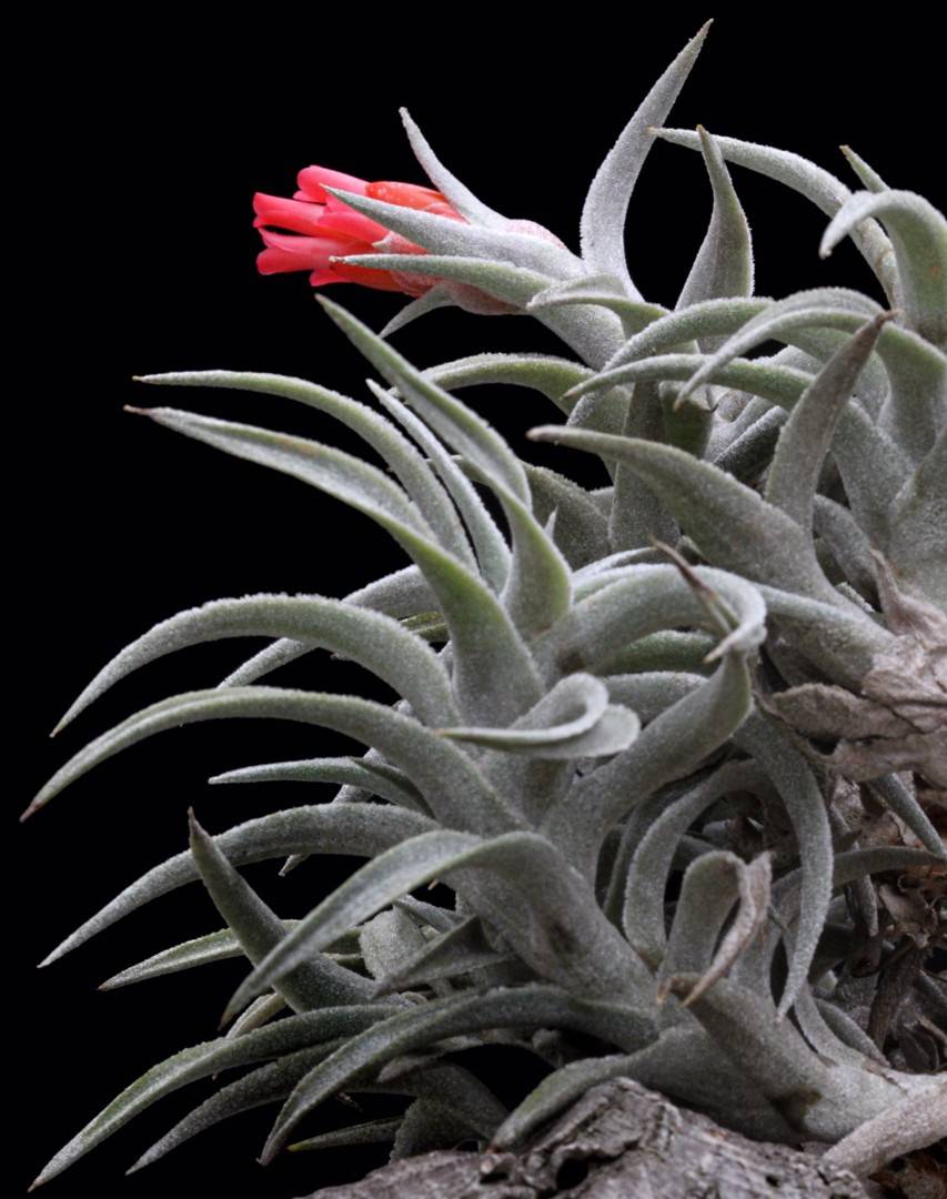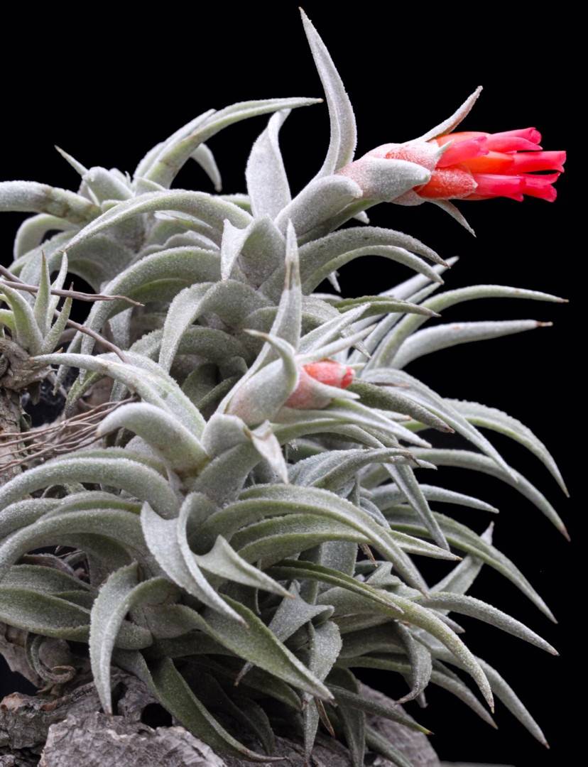In 1974, Werner Rauh described the stunning Tillandsia edithiae Rauh (1974: 19), with its bright red inflorescence and fleshy red corolla, from La Paz, Bolivia. The species is quite variable and plants from several populations look different. The most common form has somewhat purplish tinged cinereous leaves and in 1995 we saw steep mountain slopes fully covered with this plant in the province of Santa Cruz, Bolivia, indicating that it is locally very abundant. Near Samaipata we collected a very short leaved and succulent form that unfortunately did not survive. Some populations have somewhat larger plants with leaves about 8 cm long (Fig. 1) and others look similar but with shorter leaves of about 5.5 cm long. In cultivation they can grow to over half a meter in length, developing many offshoots on the old leafless stem. Although beautiful, they do not flower often. In a clump of the several shoots, normally only a few will flower at the same time and some of my clumps have never flowered.