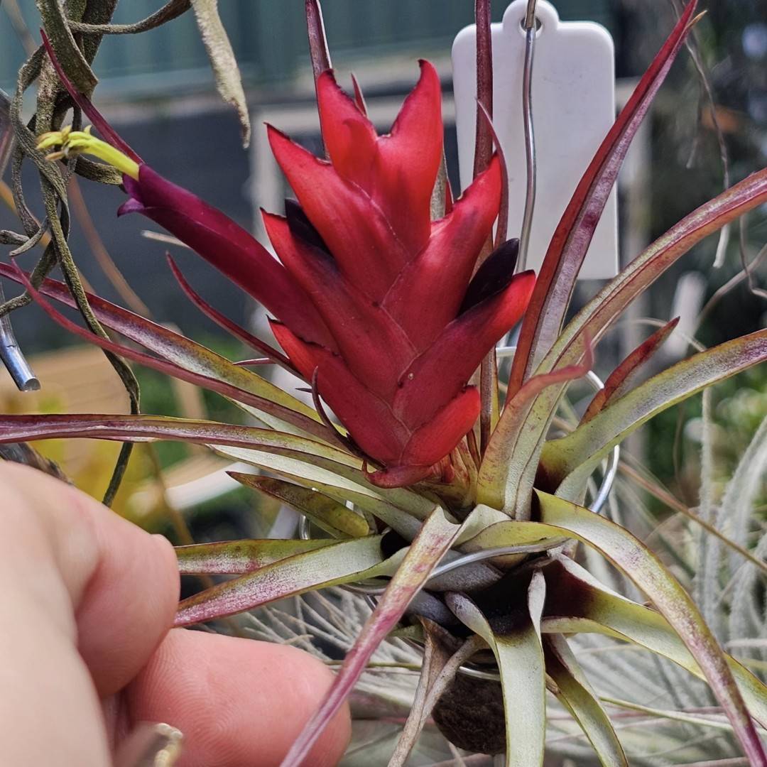 Aaron James Handley ... "- something different from most till flowers, chunky miniature inflo, very dark purple petals (they look black when emerging). This pretty plant grows in full all day sun and already had leaves blushing red prior to bloom.