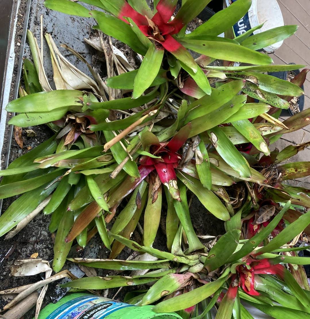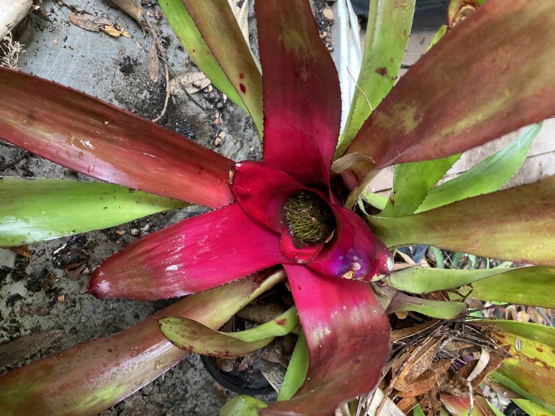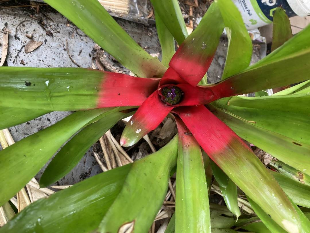 #89, 04/14 from Joy Marshall. Big pot, took 1 pup. Aechmea. Large/prickly like Mary Brett but leaves all green & petals blue. Possibly from the grex of Mary Brett, one of which is described as "lilac-blue like Ae. recurvata"